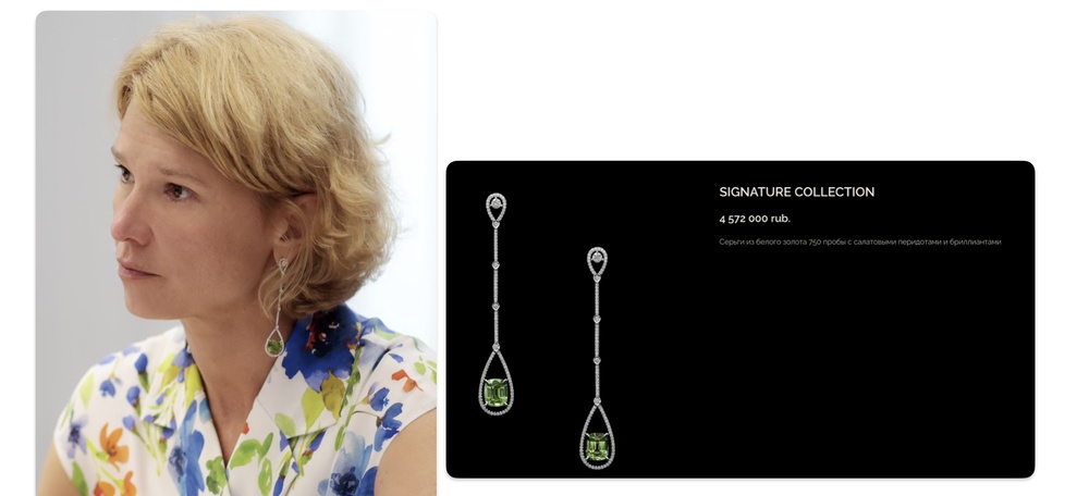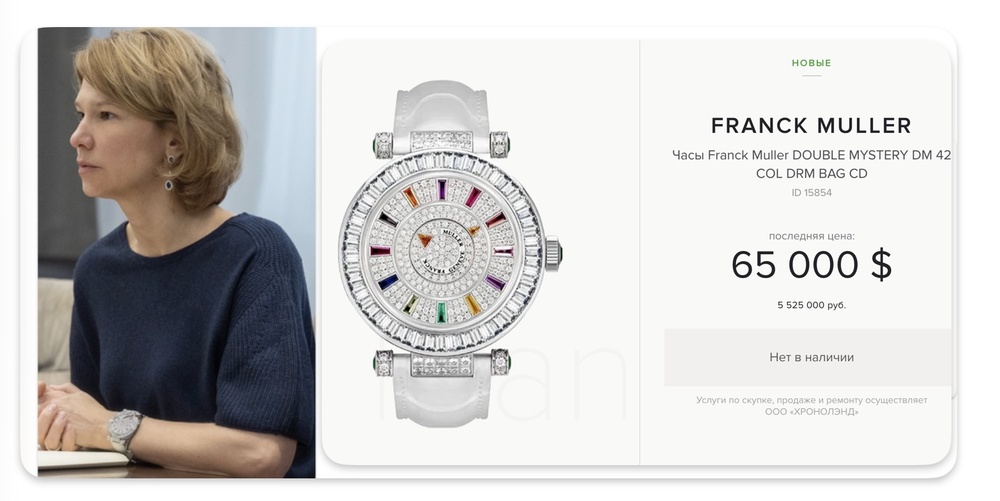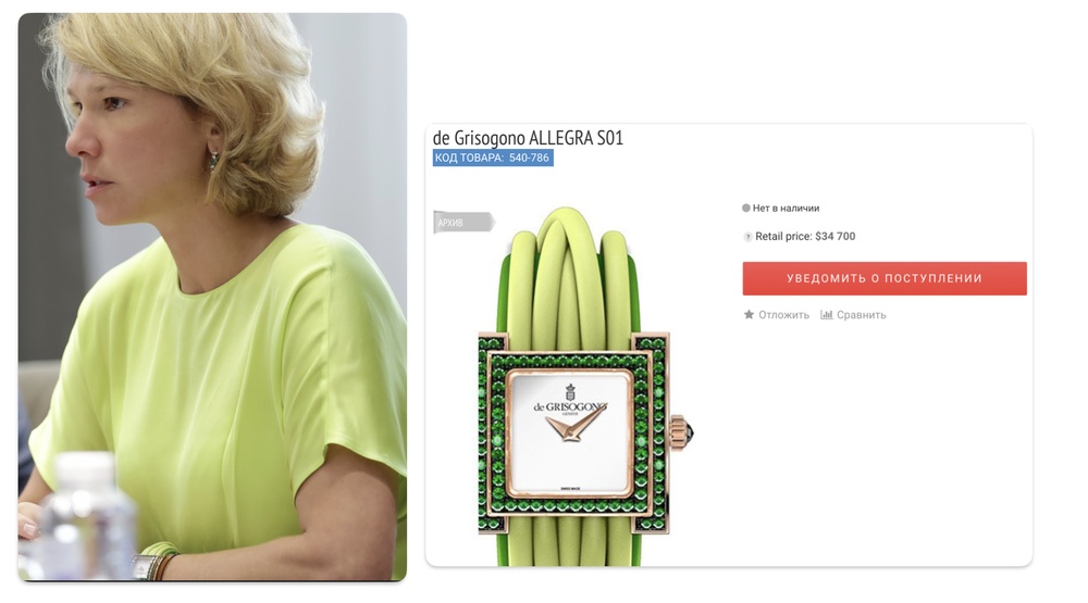 А вот такую модель Лут надевала во время встречи с губернатором Башкортостана Хабировым, они там обсуждали, между прочим, повышение качества жизни в сельской местности. Об этом куда приятнее говорить в часах с 88 зелеными изумрудами и корпусом из розового золота. Цена — 2,8 млн рублей.