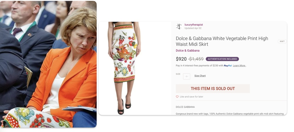 А вот еще одна юбка, тоже Дольче и Габбана, с целым овощным набором — помидорки, капуста, тыква, болгарские перцы — такая стоит около 120 000 рубей.