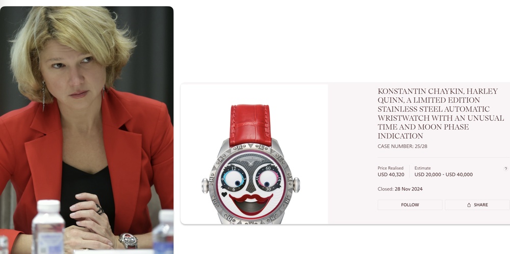 Вот еще одни: от российского часовщика Константина Чайкина, модель Харли Квинн, в честь знаменитой злодейки из Бэтмэна. Таких выпустили всего 28 штук, стоят 3,3 млн рублей.