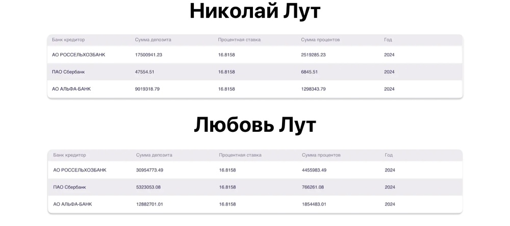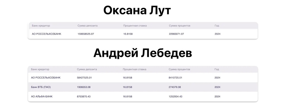А еще 230 миллионов рублей мы обнаружили у Оксаны Лут и ее супруга на банковских вкладах (недавно и такая утечка была).