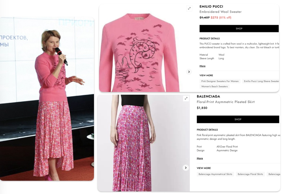 Еще у нее есть свитер с рыбой бренда Эмилио Пуччи 120 000, а с ним в комплекте юбка в ромашку от Баленсиага — 152 000.