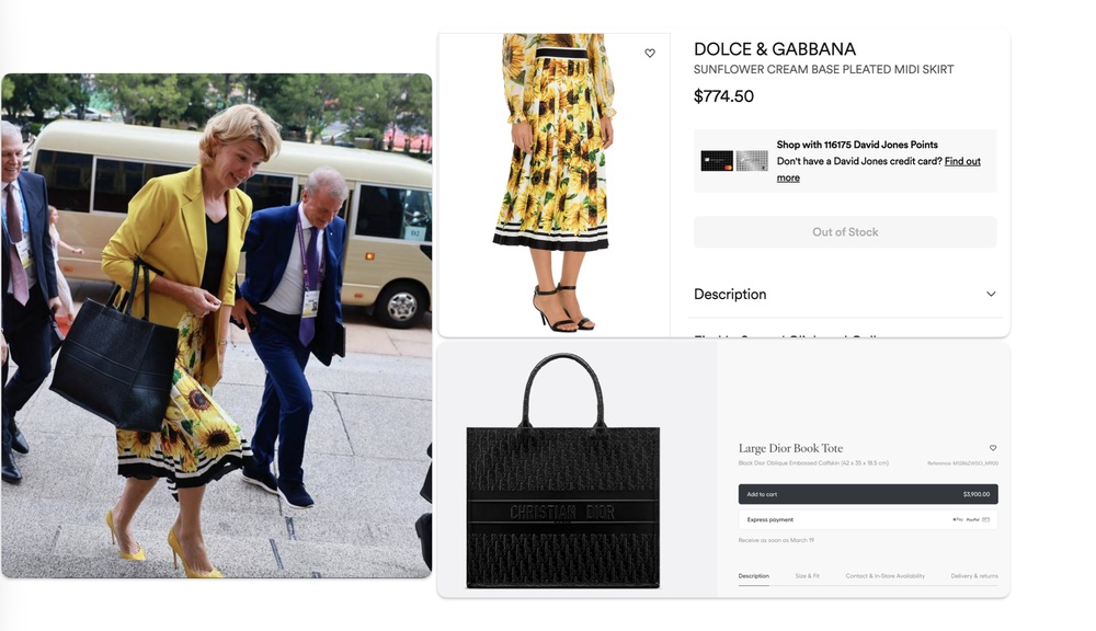 Если вы думаете, что это разовый случай — ошибаетесь. Чтобы продемонстрировать свою любовь и близость сельскому хозяйству Оксана Лут часто выбирает одежду с сельскохозяйственным рисунком. Вот, например, она в плиссированной юбке Дольче и Габбана с подсолнухами — такая продается за 64 000 руб. В руке у нее, кстати, сумка Диор — за 320 000.