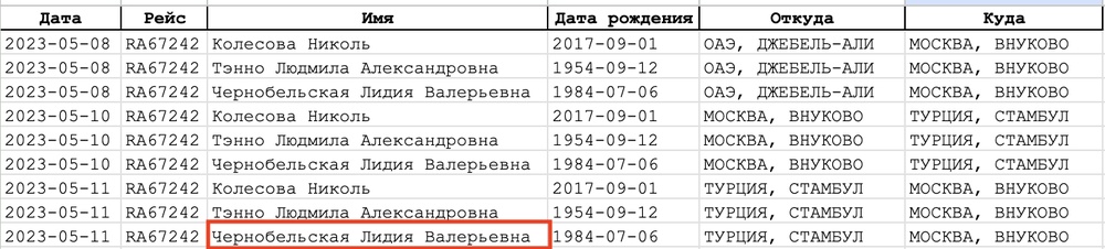 Скорее всего, она лукавит и в дела Колесовых была погружена гораздо больше, чем пытается показать. Ее мы идентифицировали — женщину зовут Лидия Чернобельская, и с Колесовыми она связана не только по Испании. В 2023 году она минимум трижды летала на частном самолете Колесова с его семьей в Дубай и Турцию.