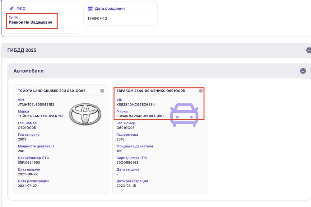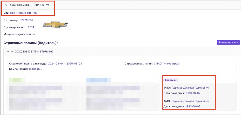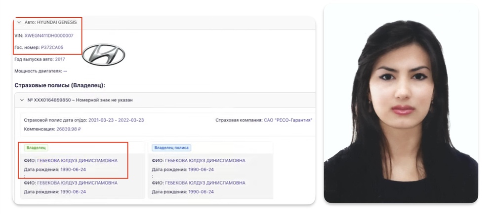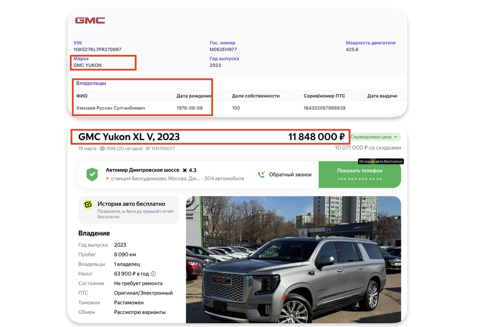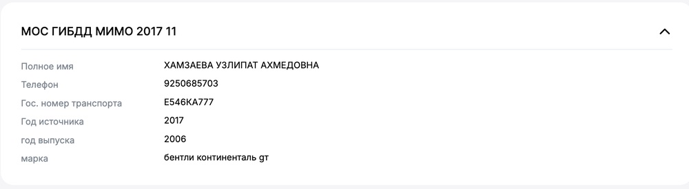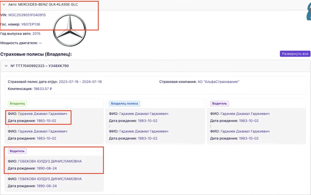 На этого же водителя записали автомобиль мерседес GLC. В качестве водителя там записана и жена Хамзаева Юлдуз Гебекова.