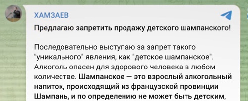 Например, детское шампанское, его Хамзаев сравнивает с детским кокаином.